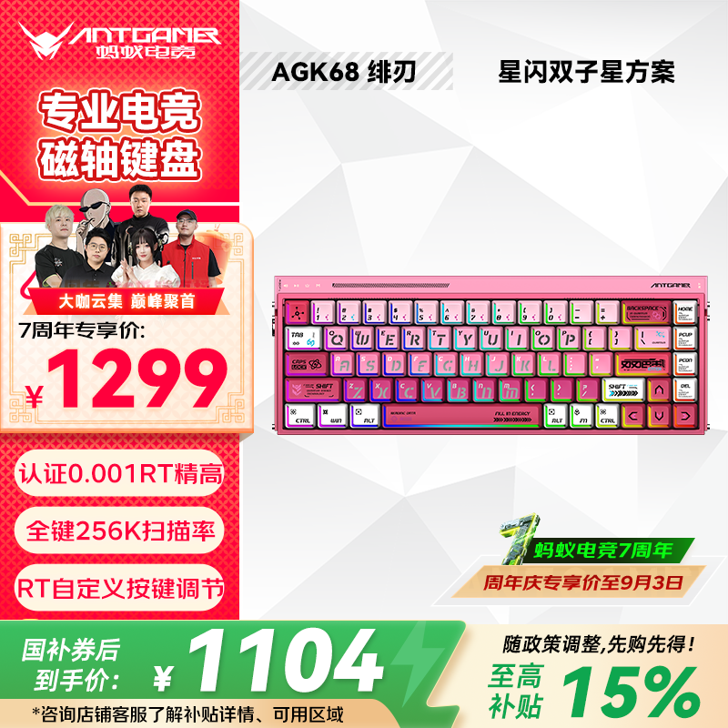 蚂蚁电竞 AGK68 键盘三个版本的售价均为 1299 元,在享受 15% 政府补贴后到手价为 1104.15 元。
