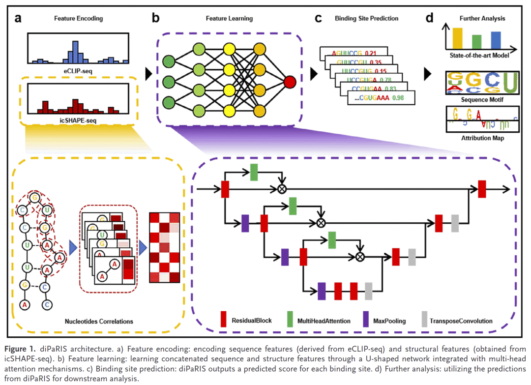 diPaRIS由特征编码、特征学习和结合位点预测三部分组成。通过eCLIP-seq提取序列特征、icSHAPE-seq获取结构特征,再采用自注意力机制进行特征对齐。核心创新是icSHAPE-Dynamic Structure (icSHAPE-DS) 编码,能捕捉相邻核苷酸间的结构关联。U型深度残差网络结合多头注意力机制,实现多尺度特征学习,并最终通过全局期望池化和多层感知机输出预测分数。