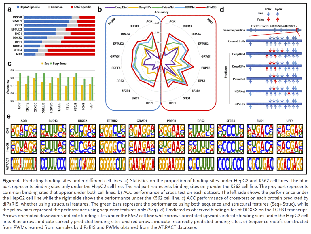 蛋白结合位点在不同细胞环境中存在特异性,diPaRIS在跨细胞系预测中表现优异,平均准确率超过0.83,显著高于其他方法。以DDX3X在TGFB1转录本上的预测为例,diPaRIS能准确识别实验检测到的结合位点,而其他方法部分失败。
