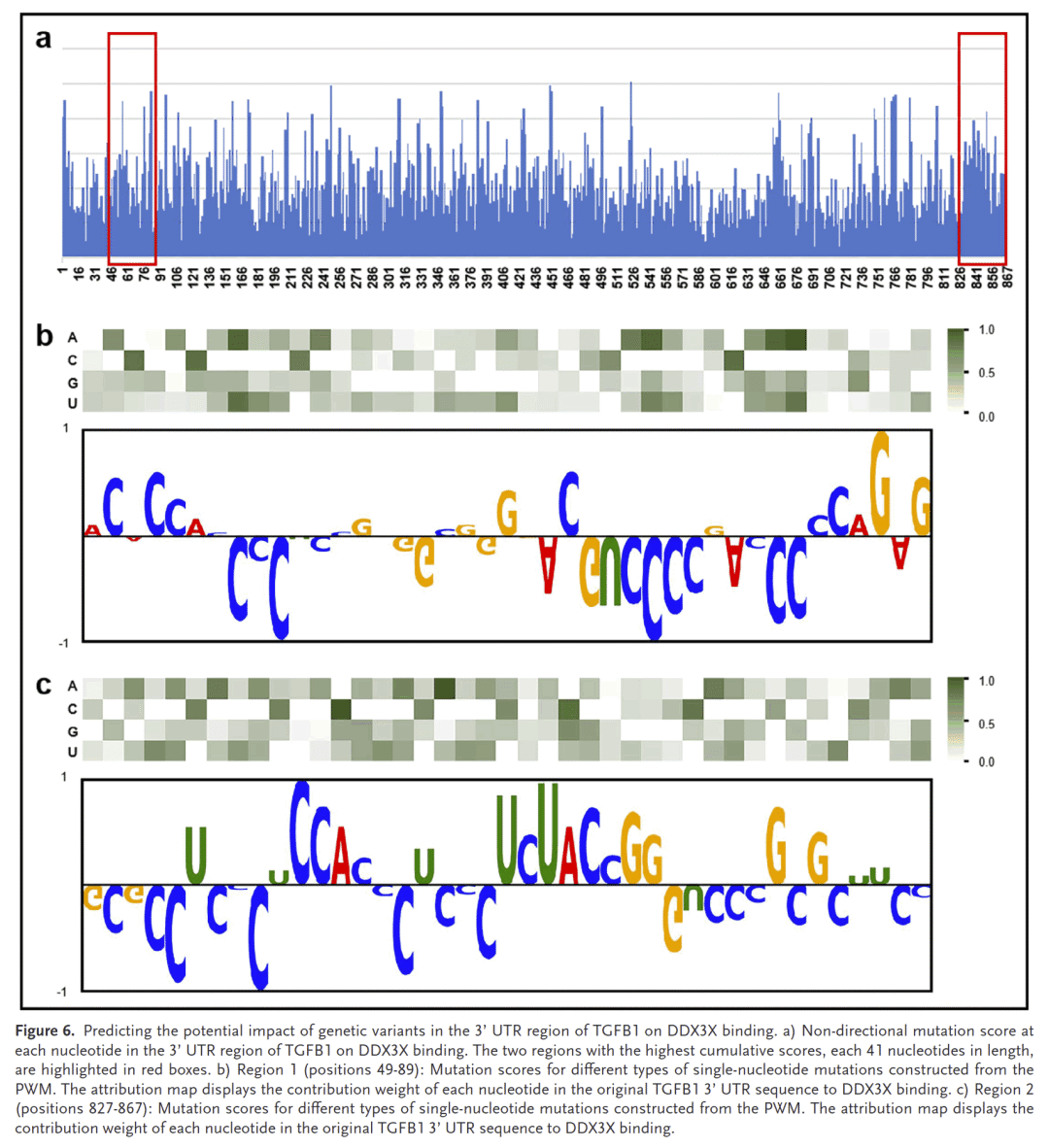 通过对DDX3X与TGFB1的互作分析,diPaRIS揭示了特定位点的变异(如C→A替换)显著削弱结合亲和力。归因图展示了关键核苷酸的作用位置,帮助解释突变对结合的功能影响。