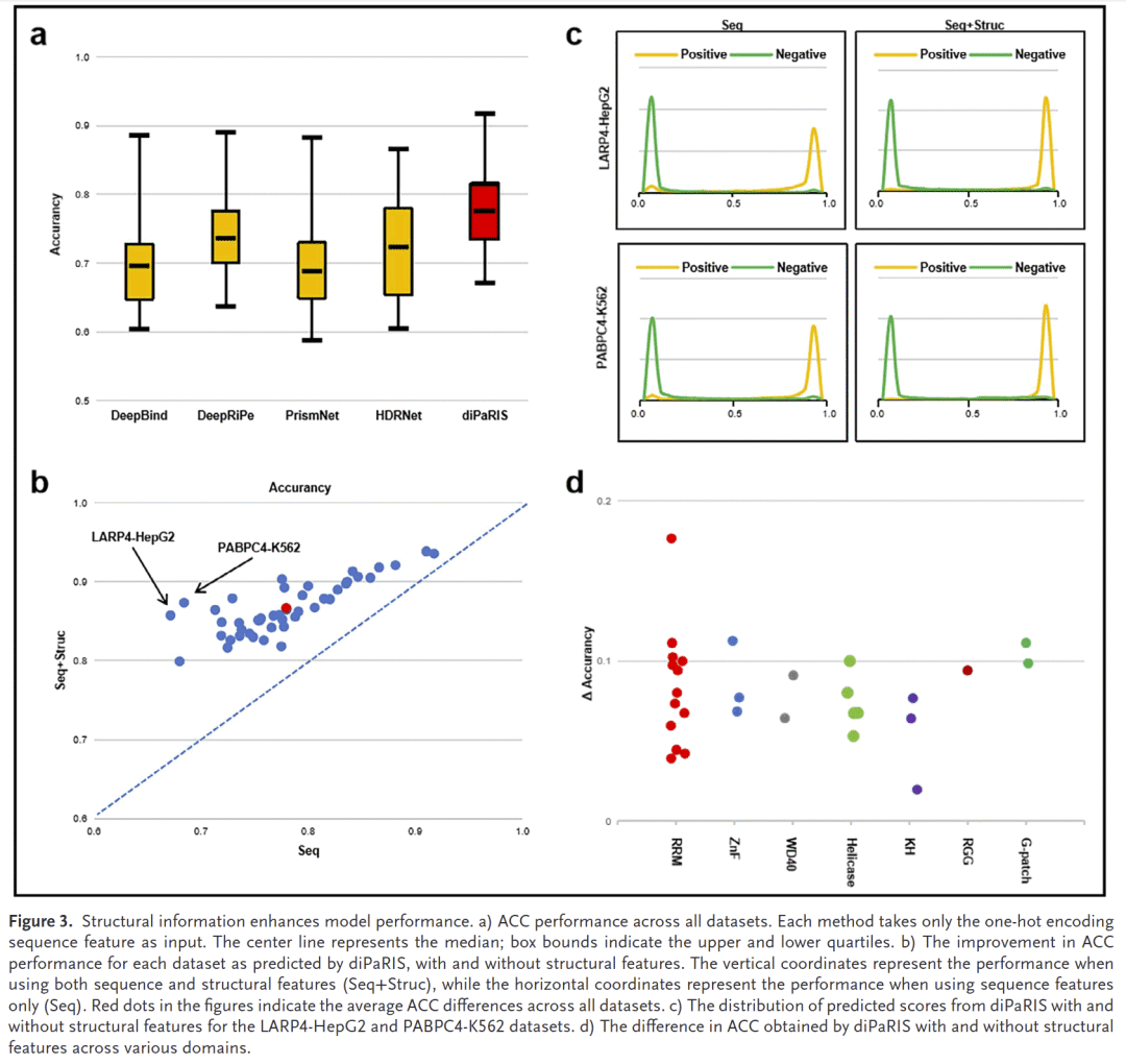 在仅用序列与同时用序列+结构的对比中,加入结构信息显著提升了预测效果,尤其在LARP4-HepG2和PABPC4-K562中改善最明显。不同蛋白结构域的分析表明,G-Patch、ZnF和部分RRM结构域对结构信息依赖性较高。