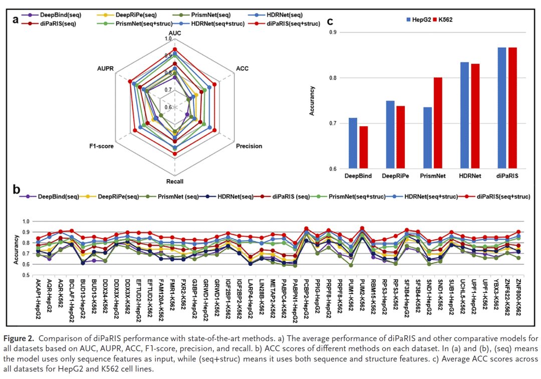 与DeepBind、DeepRiPe、PrismNet和HDRNet相比,diPaRIS在所有指标上均表现最佳,平均AUC达到0.9381,AUPR为0.9017。特别是在PUM2-K562、PCBP2-HepG2和SF3B4-HepG2等数据集上表现突出,准确率超过0.92。