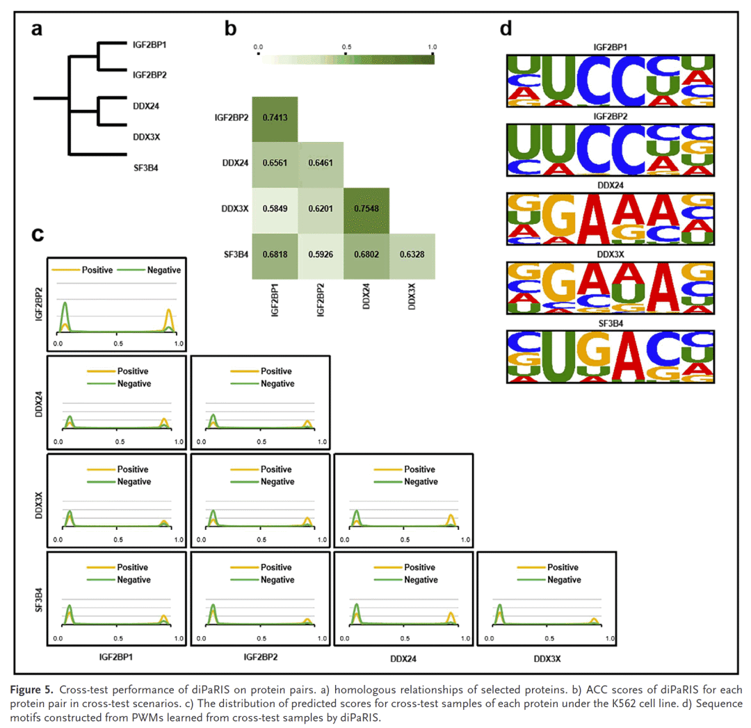 diPaRIS能捕捉蛋白家族间的保守性。在IGF2BP家族和DDX家族中,跨蛋白预测的准确率明显高于非同源蛋白。序列基序分析进一步验证了这种保守模式。