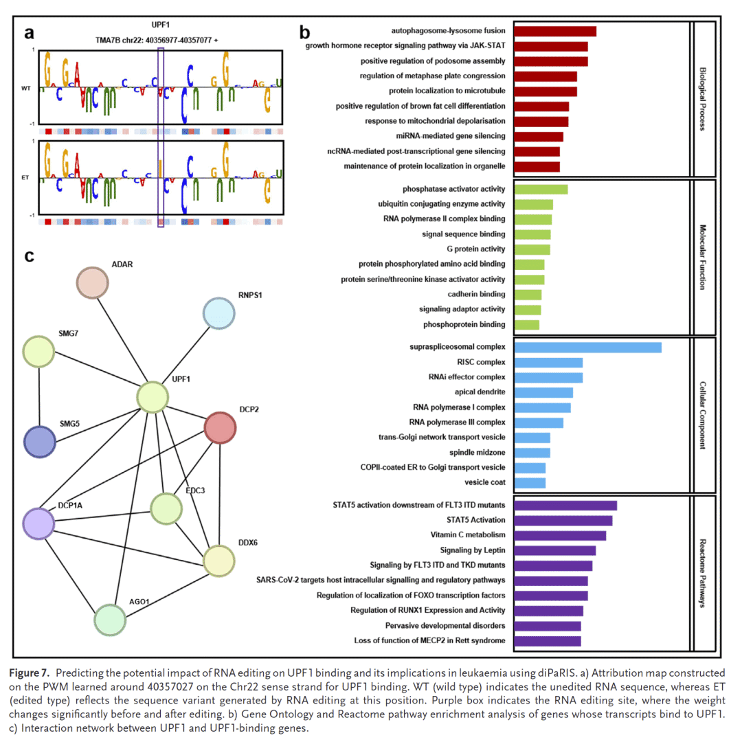 研究人员利用diPaRIS分析A-to-I编辑对RBP结合的影响。在K562细胞中,UPF1的结合位点显著受编辑影响,部分结合增强,可能通过免疫相关通路促进白血病进展。GO和Reactome富集分析显示这些基因与肿瘤发生密切相关。