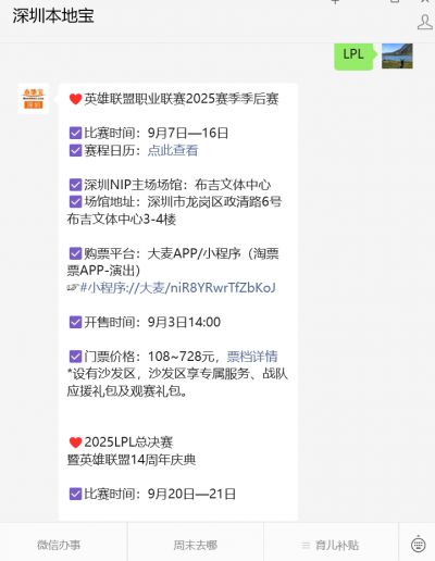 温馨提示:微信搜索公众号【深圳本地宝】,关注后在对话框回复【LPL】获取深圳2025LPL季后赛、总决赛时间地点,观赛门票价格、开售时间、购票入口,酒后赛赛程日历、赛程图等