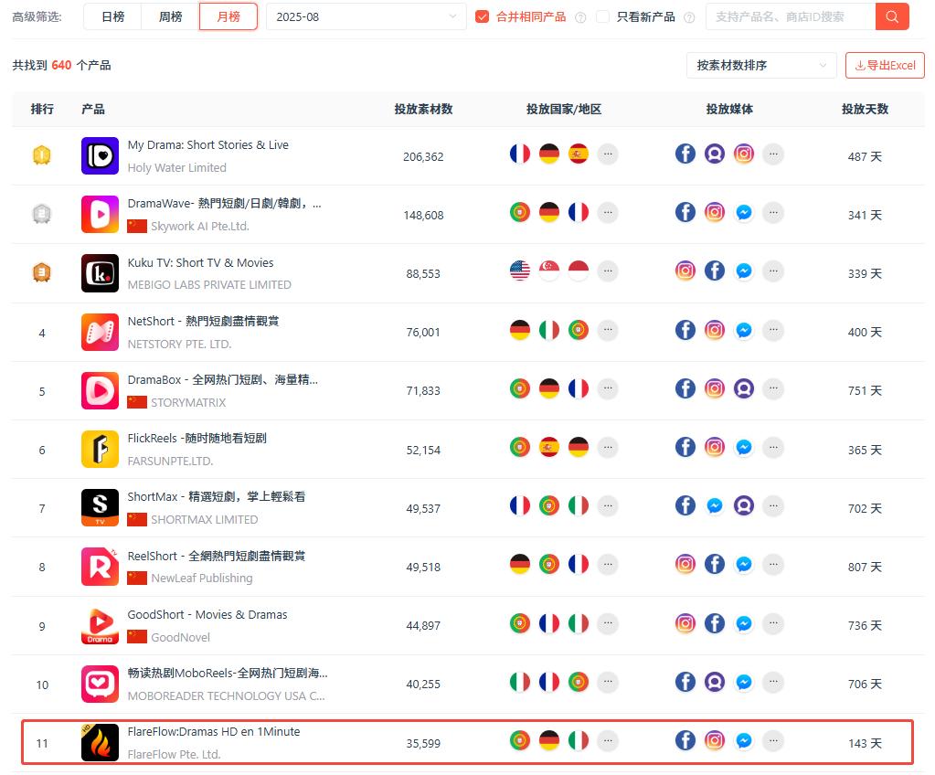 8月海外APP素材投放榜 中,FlareFlow 位居第11,当月素材投放量达 35599 组。