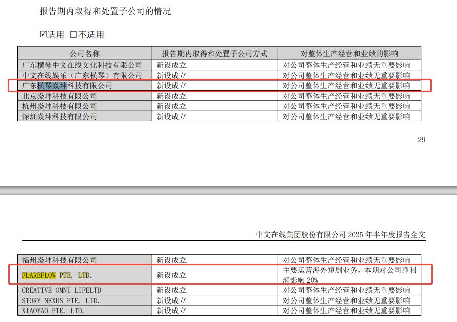 财报中显示,FlareFlow所属的中文在线子公司,FLAREFLOW PTE. LTD.今年3月设立于新加坡,主要运营海外短剧业务,由中文在线100%控股,本期对公司净利润影响达20%。