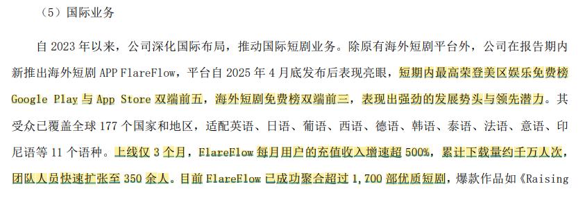 同时,财报中还指出,“FlareFlow自2025年4月底发布后表现亮眼,短期内最高荣登美区娱乐免费榜GooglePlay与AppStore双端前五,海外短剧免费榜双端前三。上线仅3个月,FlareFlow每月用户的充值收入增速超500%,累计下载量约千万人次,团队人员快速扩张至350余人。目前FlareFlow已成功聚合超过1700部优质短剧。”
