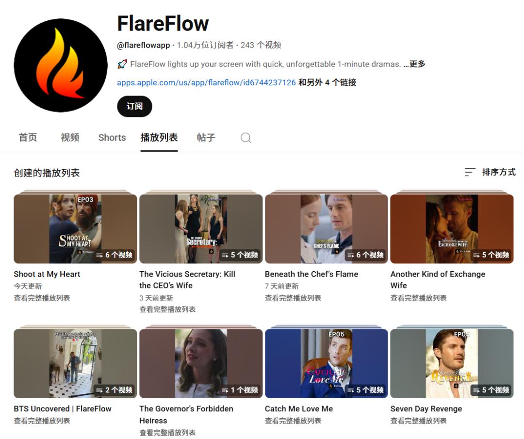 从主投的短剧素材来看,是以本土剧居多,主打“长素材直投”策略,大部分素材都超过5分钟以上,直接输出完整剧集片段,并通过多语种覆盖全球受众。其中6月上线的Raising His Mistress's Child的素材占比最高,达7.57%,该短剧共有10个语种译制版本。该剧相关素材切片在YouTube的FlareFlow频道主页上播放量也超4万次观看。