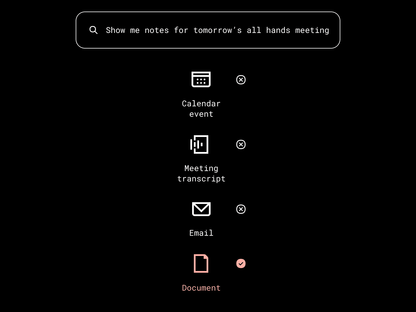 For example, the request “Show me the notes for tomorrow’s all-hands meeting” gets broken down as: