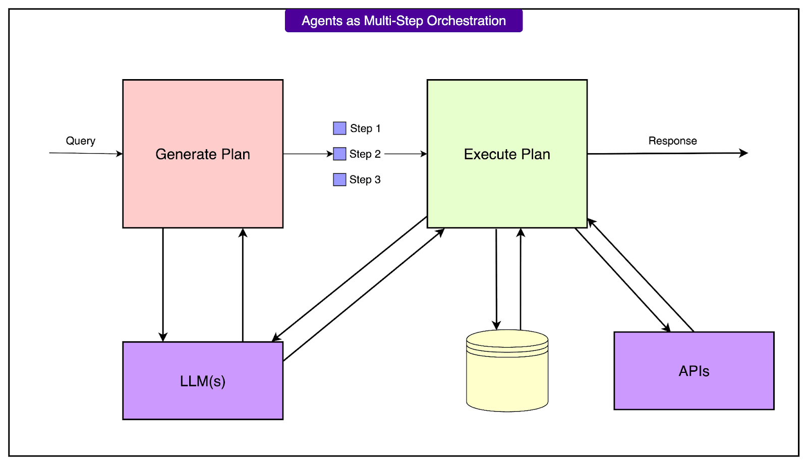 The agent starts with a query from the user. It passes that input to an LLM, which translates it into a sequence of logical steps expressed in code. This code is written in a Python-like domain-specific language (DSL) designed specifically for agent planning.