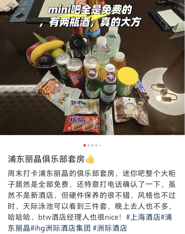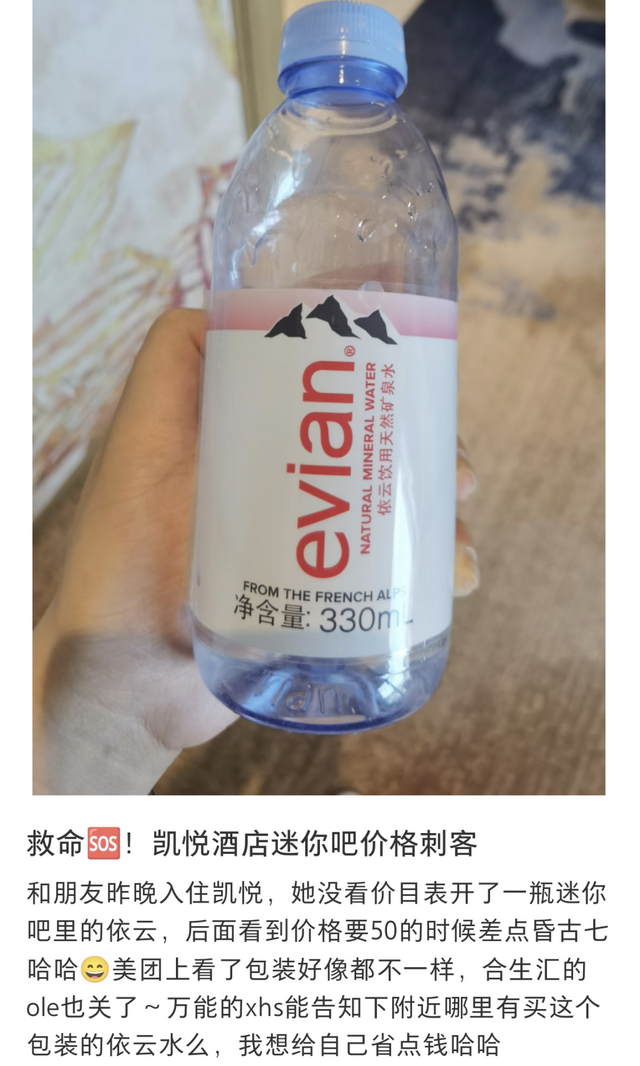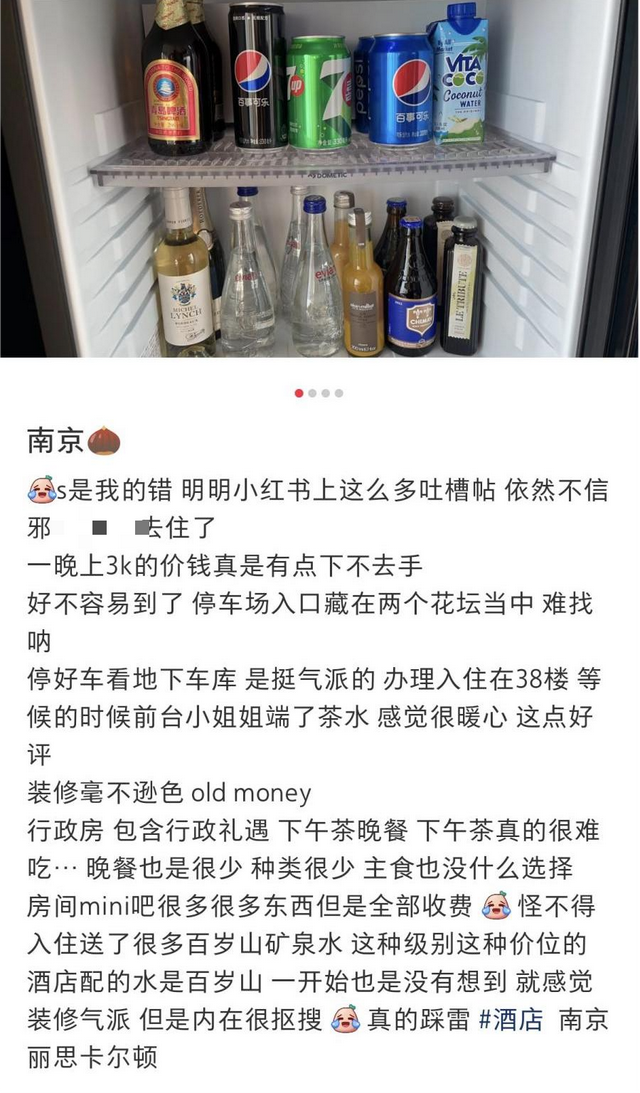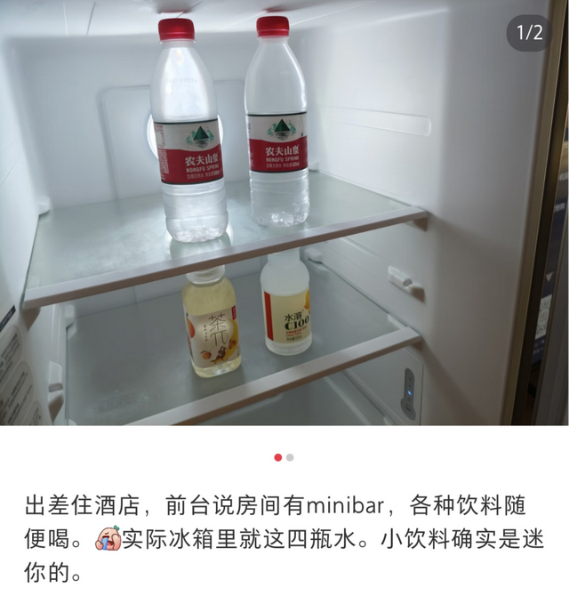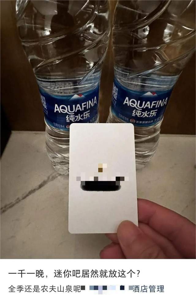 就像上面图片中网友吐槽的一样:“一千块一晚的酒店,迷你吧中仅配了2瓶纯水乐矿泉水”,单瓶价格甚至不足1.5元,客人难免会有心理落差。