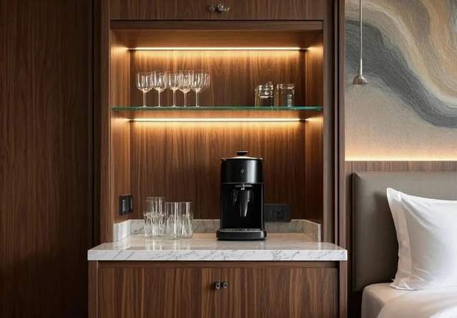 比如:咖啡机配胶囊是工作区的伴侣,小冰箱是存放自己饮料的贴心设施,零食篮可以成为欢迎礼遇的一部分。这样所谓的“迷你吧”就无处不在,却又无迹可寻。