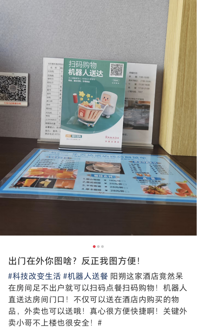 用科技手段赋能迷你吧,让客人再度拥抱“无感消费”。比如桂林阳朔华美达度假酒店,房间内放置购物二维码,扫码下单,解放人力,机器人送货上门。将把选择权还给客人,把效率还给酒店。