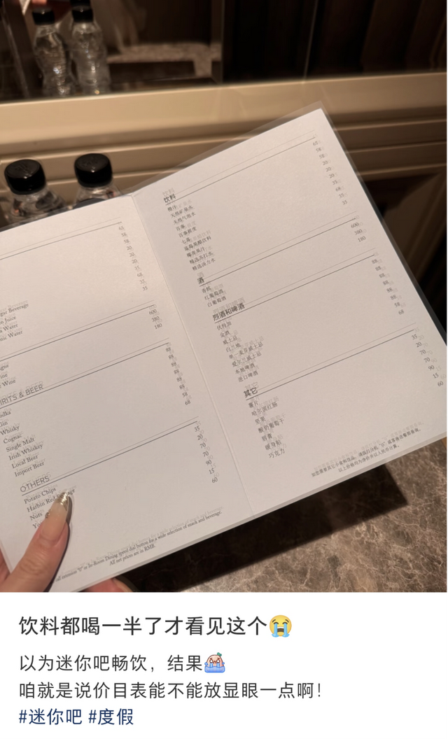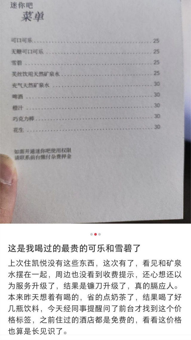 在社交平台上搜索后发现,用户被酒店迷你吧“刺伤”的经历比比皆是。有人说:“退房一看账单,血压飙升!”还有人称迷你吧是“消费刺客”,明明超市卖3元的可乐,标价翻倍还不提前告知。