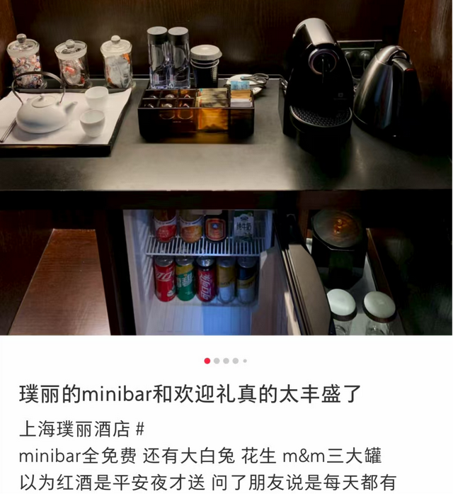 部分酒店把迷你吧做成“品牌的体验触点”。比如澳门安达仕酒店迷你吧内东西全部免费,吃不完还可以带走;上海璞丽酒店全部免费,还提供大白兔、花生、红酒等。
