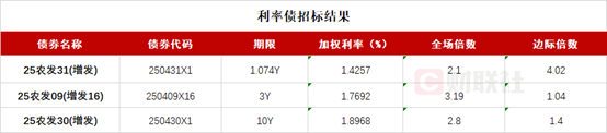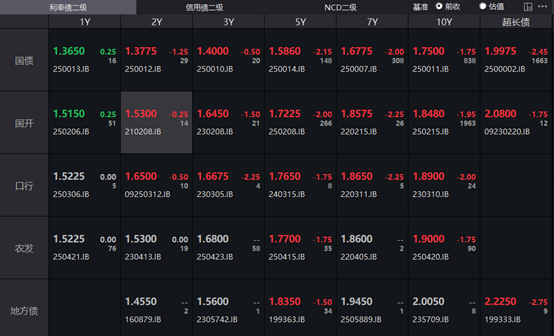 银行间主要利率债收益率全线下行,截至下午16:30,10年期国债活跃券250011收益率下行1.75bp报1.75%,30年期国债活跃券2500002收益率下行2.45bp报1.9975%,10年期国开活跃券250215收益率下行1.95bp报1.848%。