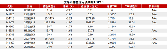 今日交易所市场非金信用债跌幅排行前五的分别是:H1碧地03、24电建K2、25深铁03、23深铁15、25电控K2。具体如下: