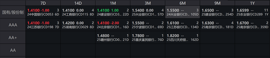 一级存单方面,今日3M期国股在1.52%-1.56%位置需求较好,1Y期国股报在1.63%-1.67%的位置。二级存单方面,6M国股成交在1.5500%附近(较前一日上行0.75BP),1Y国股成交在1.6599%的位置(较前一日上行0.25BP)。