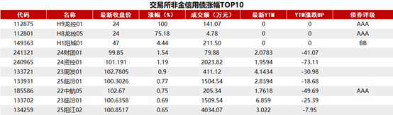 交易所债券市场收盘,据Choice 数据统计显示,今日交易所市场非金信用债涨幅排行前五的分别是:H9龙控01、H8龙控05、H1阳城01、24财团01、24资控01。具体如下: