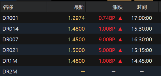 银行间回购定盘利率多数上涨。FR001涨1.0个基点报1.37%;FR007涨1.0个基点报1.47%;FR014持平报1.5%。