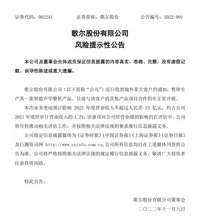 2022年11月,因为遭遇“境外某大客户”砍单,歌尔股份被市场传出可能“被踢出果链”,公司股价随之下挫,一时间阴云笼罩。