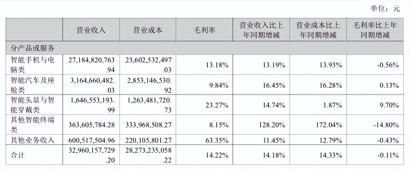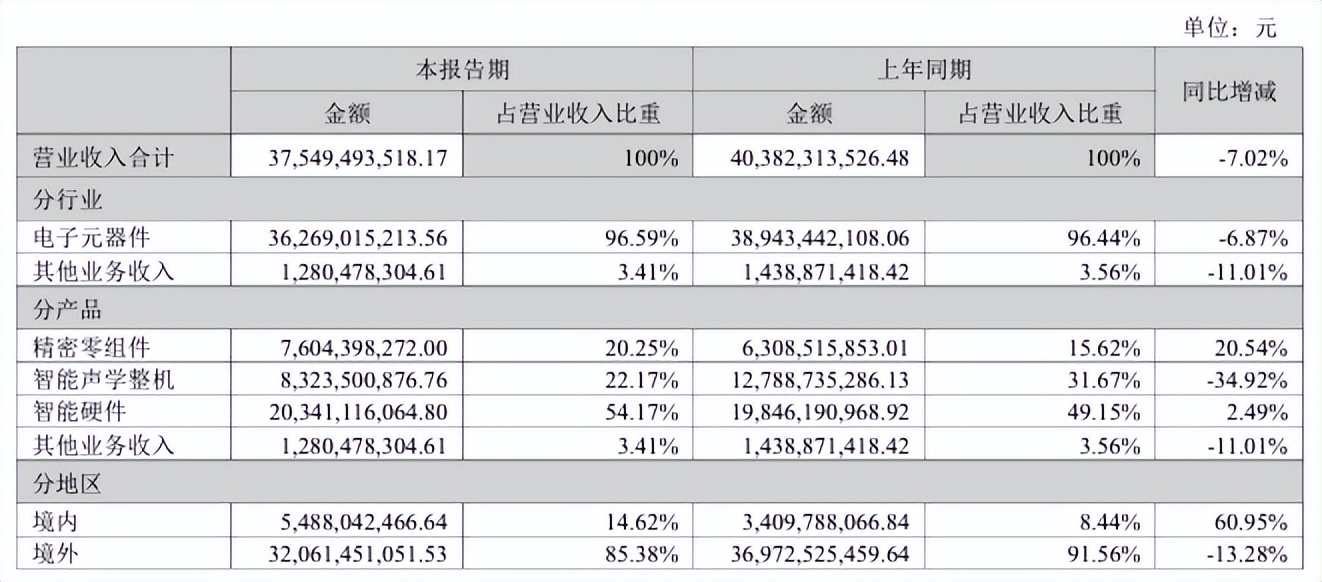 这种分化,很大程度上源于三巨头对不同业务的依赖程度。歌尔股份的智能声学整机业务,收入同比大幅下降34.92%至83.24亿元,成为拖累整体营收的主要原因。