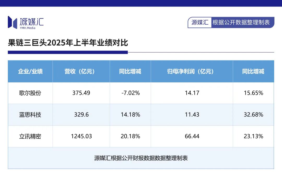 业绩最能说明问题:2025年上半年,立讯精密、蓝思科技和歌尔股份分别实现营收1245.03亿元、329.6亿元和375.49亿元,归母净利润为66.44亿元、11.43亿元和14.17亿元。
