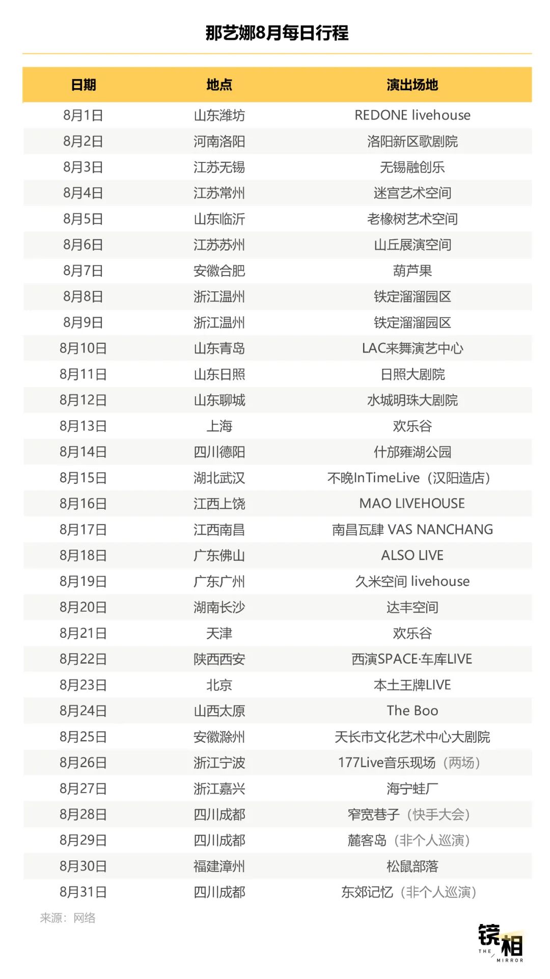 演到北京场时,那艺娜租用了全北京最大的Livehouse。由于场地租金高,最低票价翻了一倍,从99元变成188元,仍然在开票第二天就售罄了。场次越增越多,整个八月,那艺娜进行了“特种兵式巡演”,除3天有其他活动外,每天都有安排场次,基本都是千人场,其中一天连演两场。