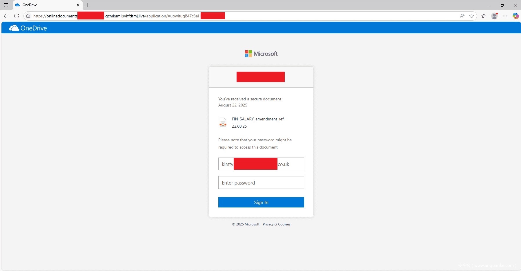 一项针对多个行业高级管理人员的精密鱼叉式钓鱼活动正在蔓延,攻击者以Microsoft OneDrive作为主要攻击载体。该活动通过伪装成内部人力资源邮件的精心设计邮件,以”薪资调整”为诱饵,诱骗高层目标人物交出企业凭证。