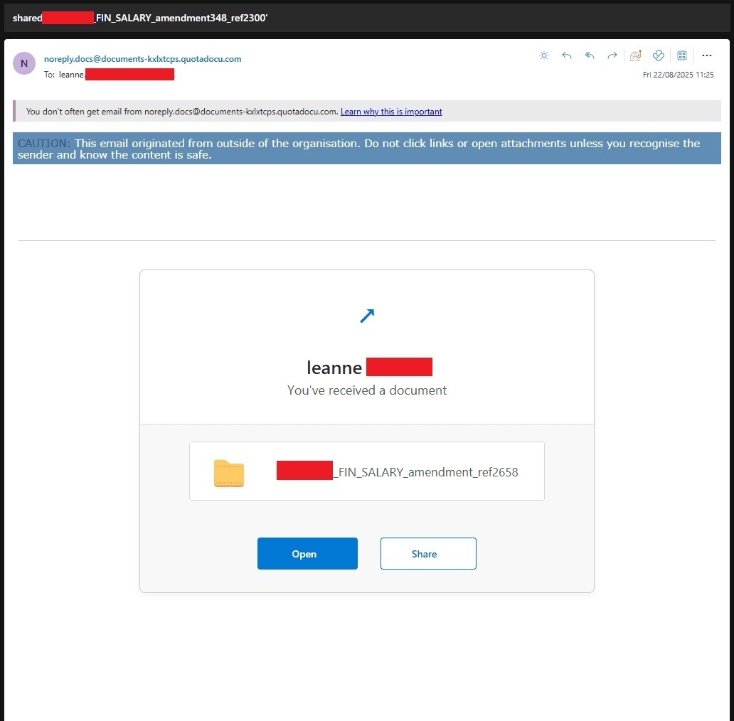 恶意邮件主题行包含”Salary amendment”或”FIN_SALARY”字样,看起来像是合法的OneDrive文档共享通知。每条信息都经过精心定制,包含收件人姓名和公司详细信息,显著提升了攻击的可信度和成功率。