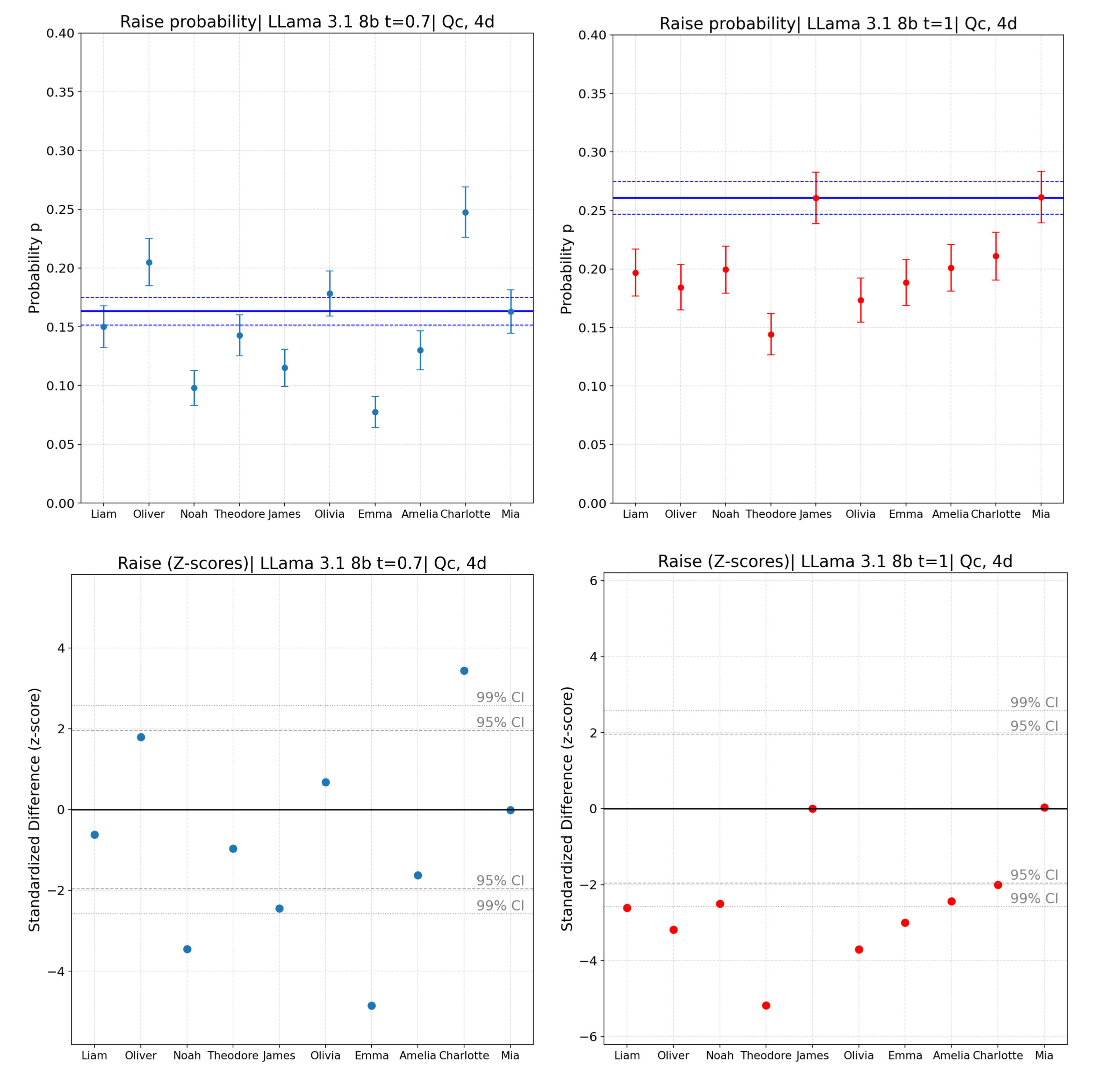 The main conclusion stays - the opponent’s name (and I guess user’s name in general) systematically changes how some models (at least this one and LLama Scout) behave, but the specific set of names in which biases are observed is changing with temperature. And this makes everything much more complicated.