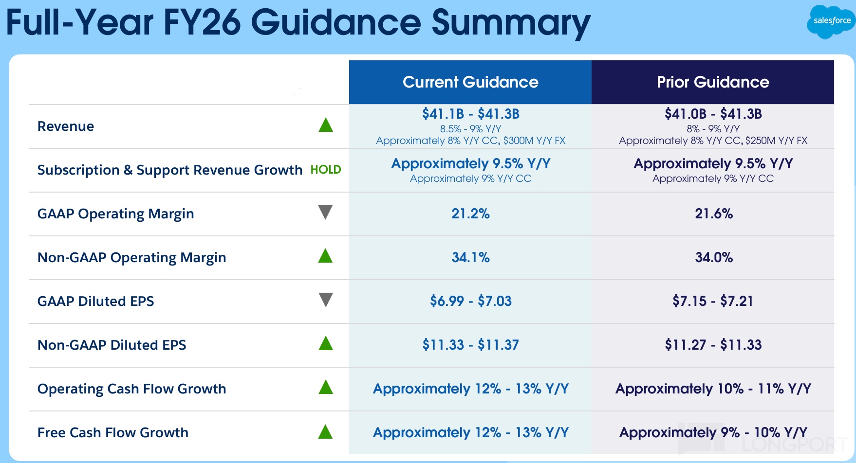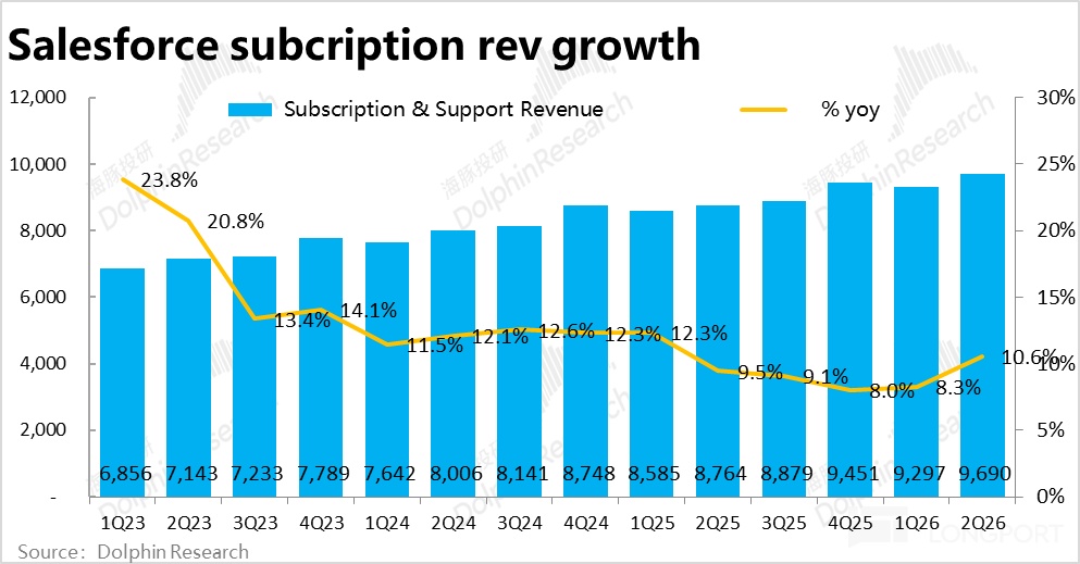 本季专业服务收入约 5.5 亿,依旧同比萎缩约 2.7%,表现和上季同样差距不大,因此Salesforce 本季总营收$约 102 亿,同比增长 9.8%,剔除汇率影响后增速为 9%,较上季小幅提速约 1pct。