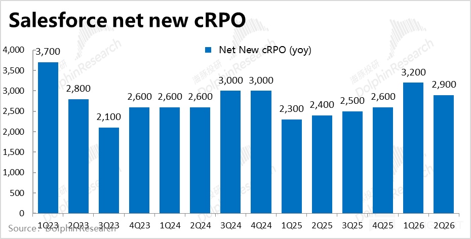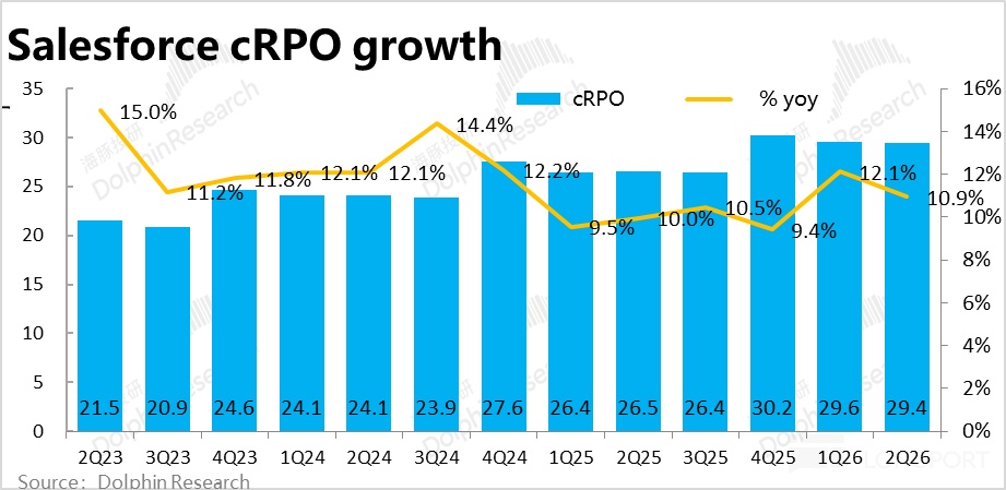 反映了后续增长前景的领先指标--cRPO(短期未履约余额)的名义同比增速本季为近 11%,较上季降速约 1pct,恒定汇率下的增速环比放缓幅度类似。本季 cRPO同比净增额 29 亿,净增额上较上季也有环比近 10% 的收窄。在上季度创出一个阶段性高峰后,2 季度内 Salesforce 的新增合约反而是走弱的。