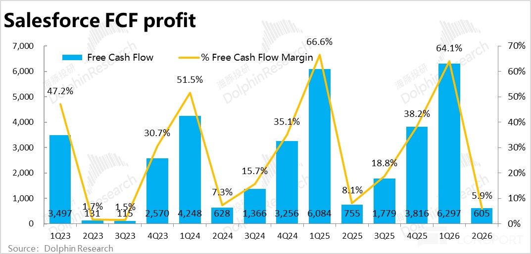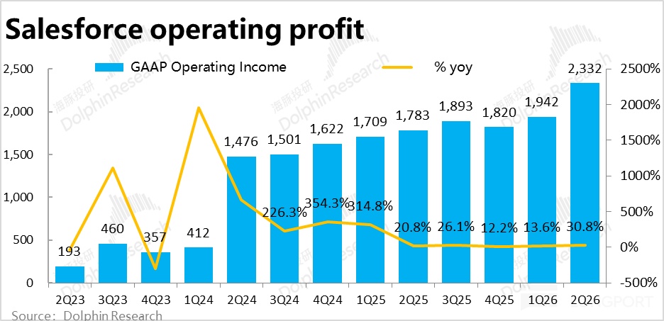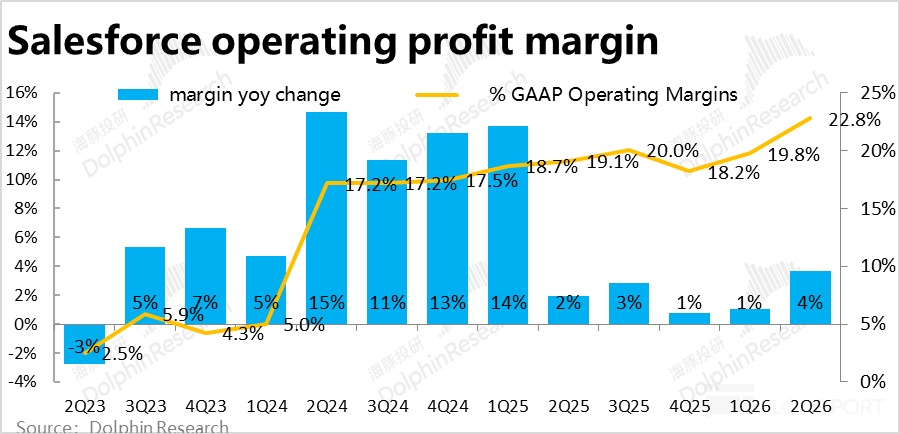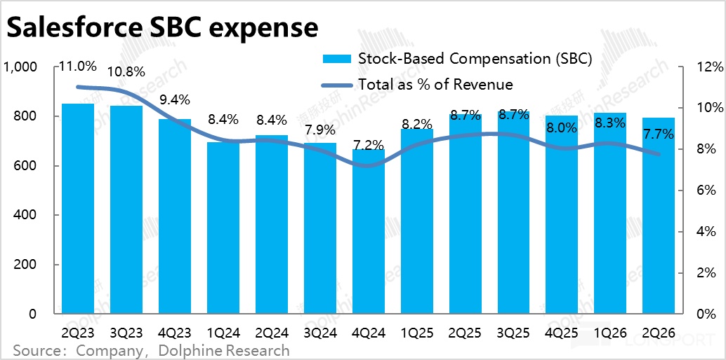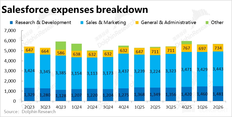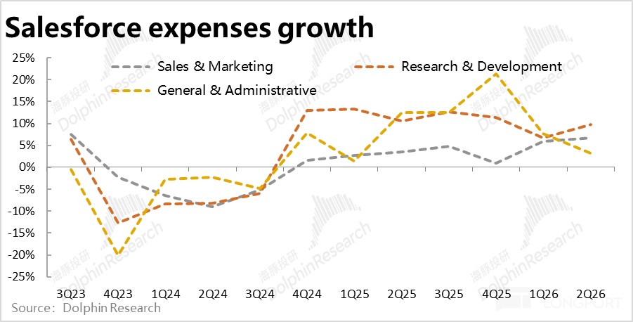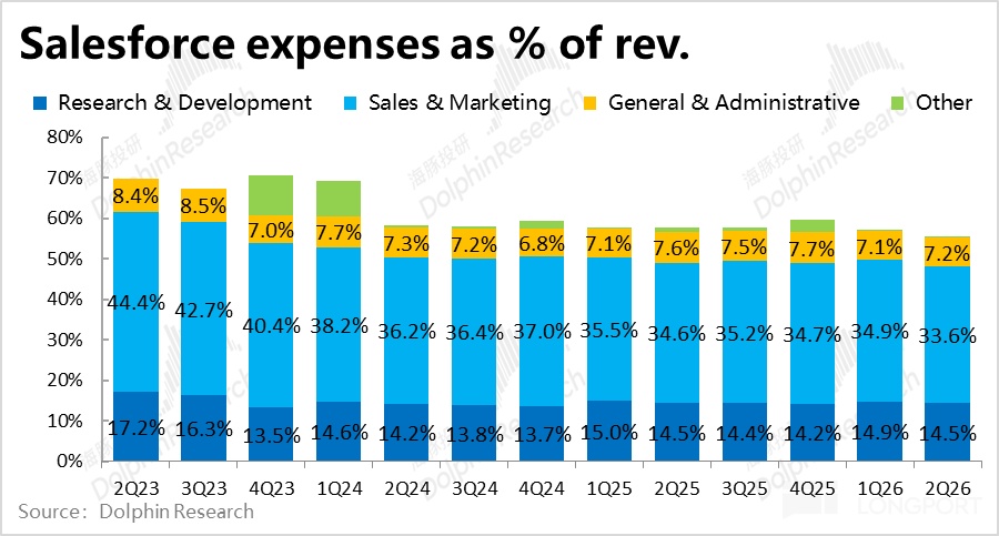 费用角度,本季Salesforce 全部经营费用支出$56.6 亿,同比增长 5.2%,较上季度 6.8% 进一步放缓,也明显低于收入和毛利的增速。因此在增长端表现并不算亮眼的情况下,靠控制费用仍是能挤出一些利润。费用率较上季环比走低近 2pct。