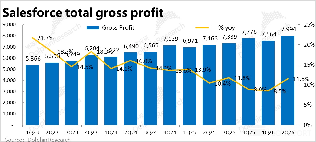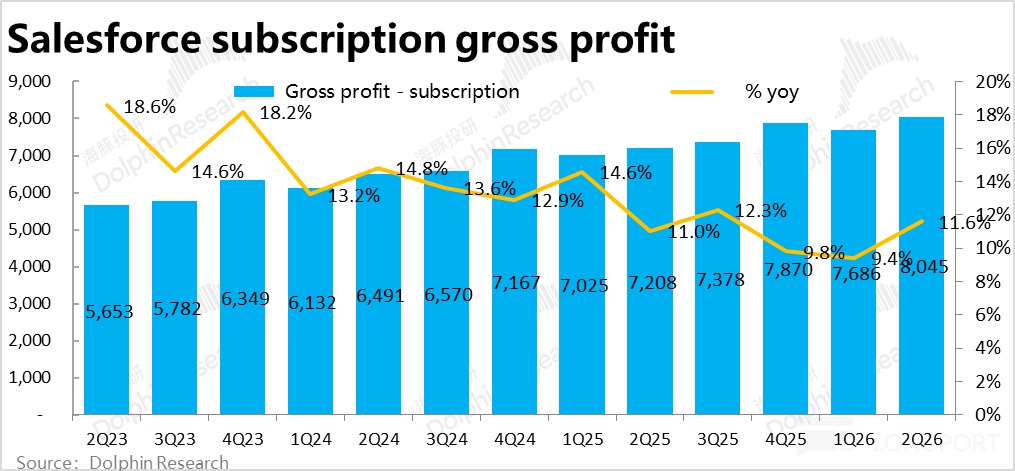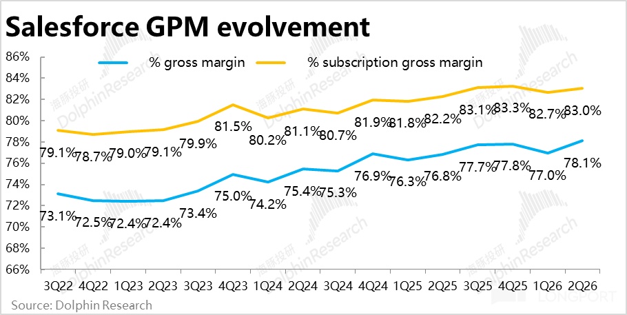 毛利层面,本季 Salesforce 的核心业务-订阅性收入的毛利润$80.5 亿,同比增长 11.6%,小幅跑超对应收入增速。