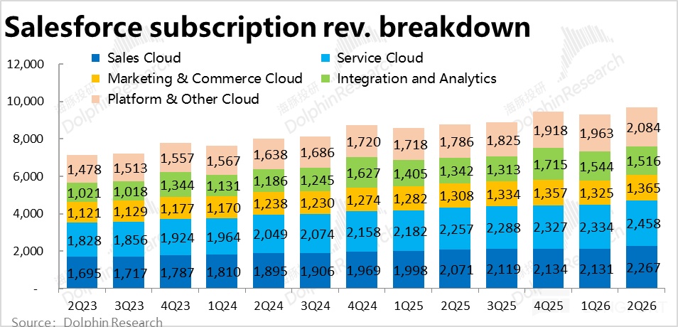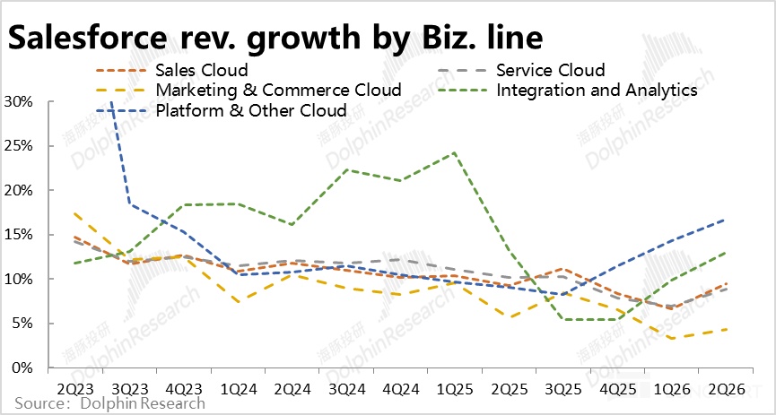 2)更具体看,依旧是商贸和营销云增长最弱,同比仅增长 4%,两大最基石的销售和服务云增速则都在 9% 上下,算是表现平稳。