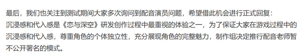 所以你可以看到,很多游戏近年来已经不主动公布CV姓名,近年几个大热的乙游更是不用说,几乎无一例外采取了配音保密的模式。