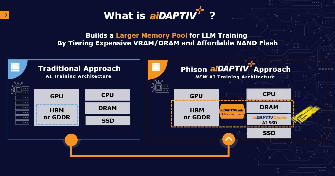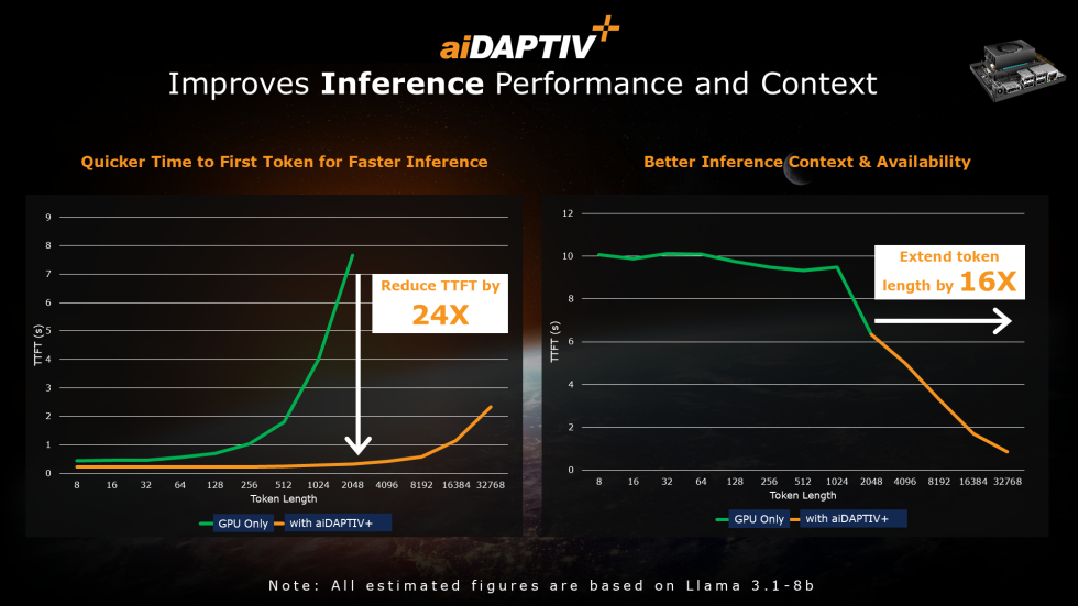 aiDAPTIV+主要訴求是可大幅降低用戶端LLM訓練設施門檻,讓只配備較少GPU與HBM記憶體的環境,利用CPU DRAM與SSD作為額外記憶體空間,從而運行較大規模的LLM。也能改善推論效能,縮短第1個Token產生時間(Time to First Token,TTFT),擴展上下文Token長度。