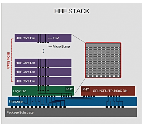 在實作上,HBF架構十分類似HBM,將16層垂直堆疊的裸晶(Die)先連接邏輯晶片(Logic Die),然後再透過中介層基板與GPU連接。