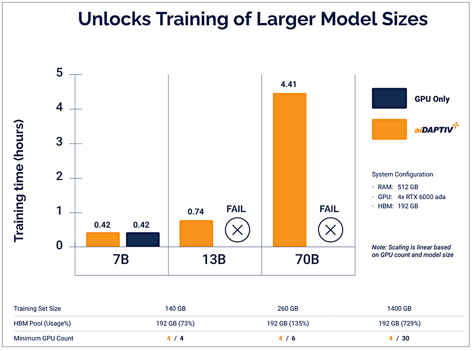 1套只配備4張GPU、只有192 GB HBM的伺服器,僅依靠GPU GDDR記憶體時只能執行7B模型(70億參數)的訓練,或是容納140 GB大小的訓練資料集,而透過AIDAPTIV+記憶體卸載功能,便能執行13B與70B模型訓練,並容納原本需要6張與30張GPU才能容納的260 GB與1,400 GB訓練資料集。