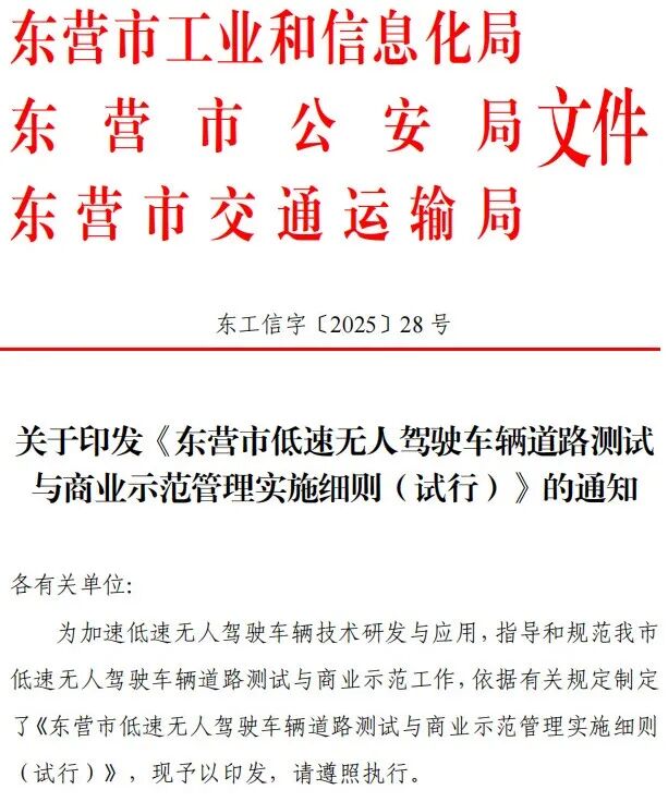 2025年6月,山东省东营市工信局、公安局与交通运输局联合印发《东营市低速无人驾驶车辆道路测试与商业示范管理实施细则(试行)》,明确要求推进低速无人车的道路测试与商业示范应用,涵盖申请要求、审核流程、管理机制及交通违法与事故处理等内容。