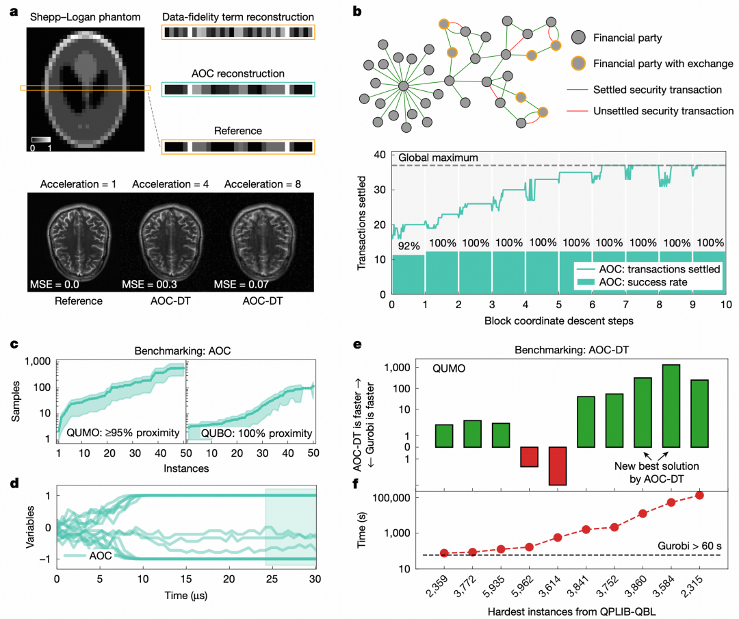 在金融领域的优化任务中,他们使用 AOC 硬件解决了一个交易结算问题。每一笔证券交易都是以支付换取证券的交换,清算所会处理这类交易的批次,在每个交易批次中,交易结算的目标是最大化已结算交易的总数或总价值。鉴于交易数量庞大,同时受到法律约束和其他附加要求的限制,这成为一项复杂的优化问题。在该交易结算场景中,AOC 硬件在 7 个块坐标下降法步骤内找到了全局最优解。相比之下,量子硬件在相同问题上的成功率仅为 40–60%。