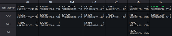 一级存单方面,今日3M期国股在1.54%-1.56%位置需求较好,1Y期国股报在1.64%-1.68%的位置。二级存单方面,6M国股成交在1.5450%附近(较前一日变化不大),1Y国股成交在1.6525%的位置(较前一日上行0.25BP)。