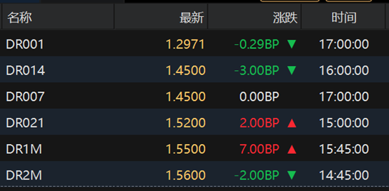 银行间回购定盘利率多数下跌。FR001跌0.02个基点报1.3698%;FR007跌1.0个基点报1.46%;FR014持平报1.5%。