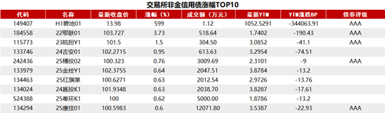 交易所债券市场收盘,据Choice 数据统计显示,今日交易所市场非金信用债涨幅排行前五的分别是:H1碧地01、22鄂联01、23皖担Y1、24吉安01、25穗投02。具体如下: