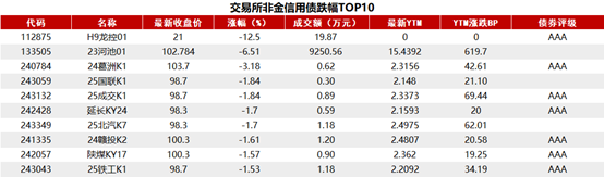 今日交易所市场非金信用债跌幅排行前五的分别是:H9龙控01、23河池01、24葛洲K1、25国联K1、25成交K1。具体如下: