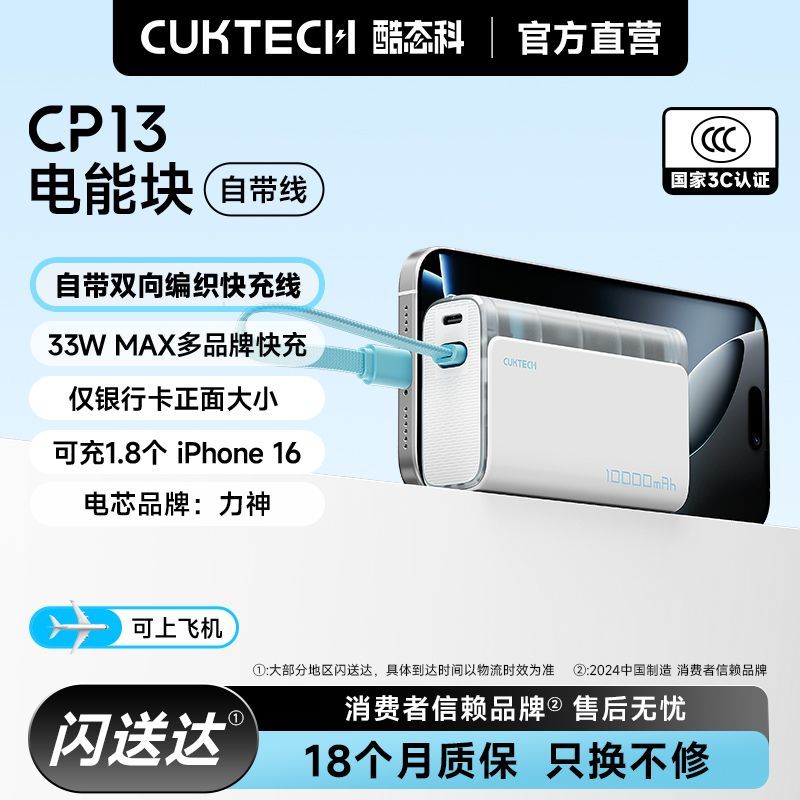 酷态科 CP13电能块10000毫安移动电源便携适用苹果16