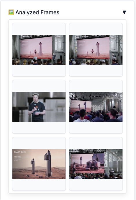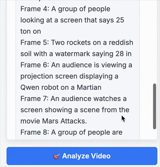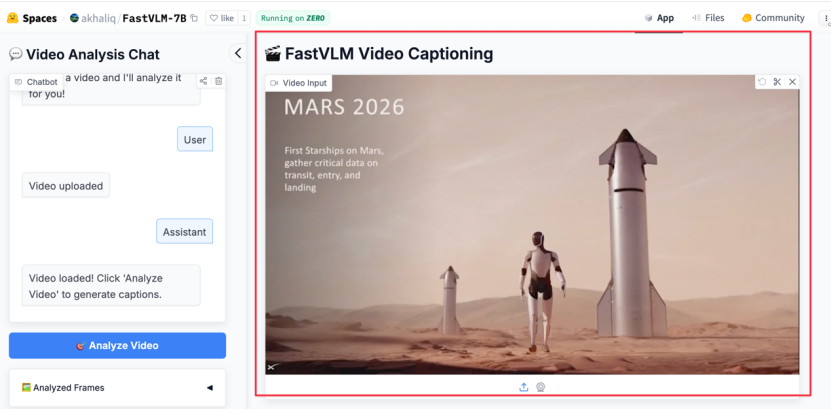 我们同样上手体验了FastVLM的强大功能。我们选取了近期在社交媒体上广为流传的“马斯克计划将擎天柱机器人送上火星”的视频作为测试材料。整个过程非常直观,上传视频后,只需点击左侧的“Analyze Video”,分析就开始了: