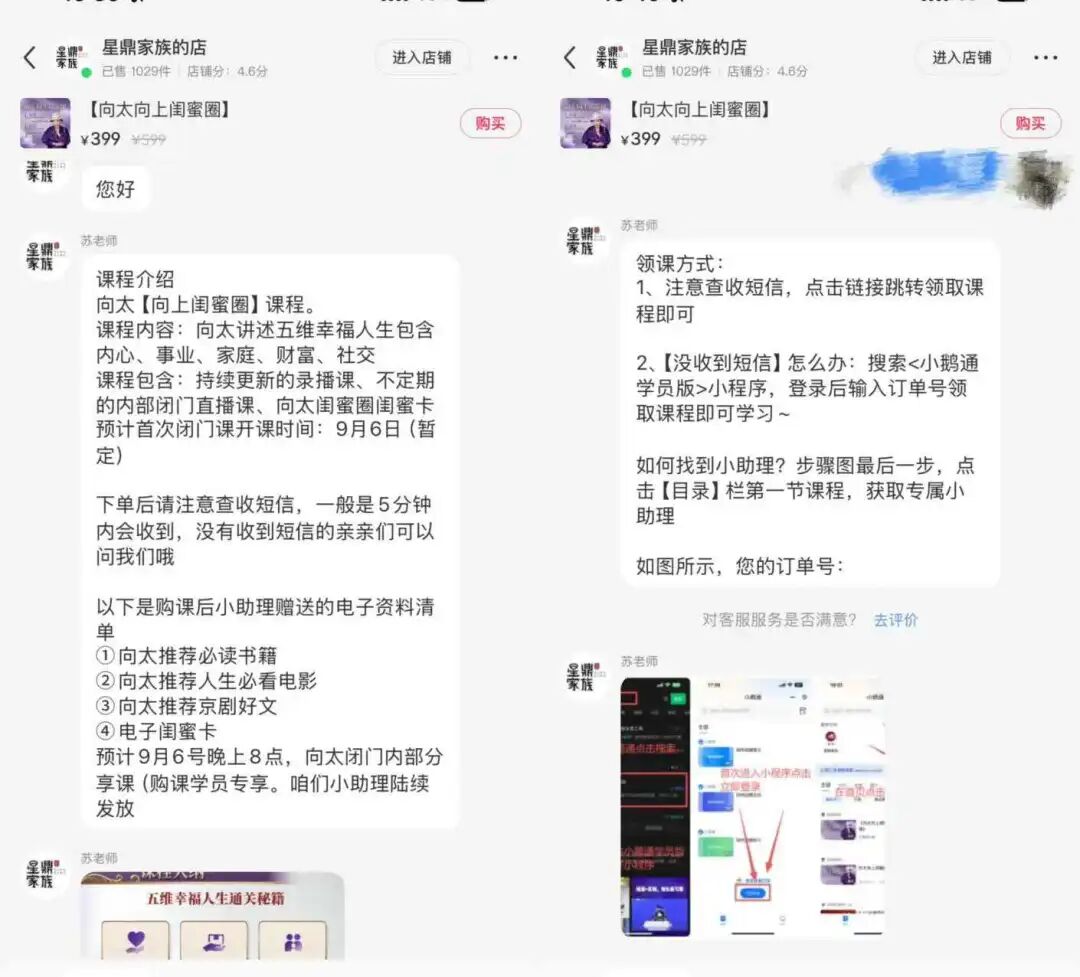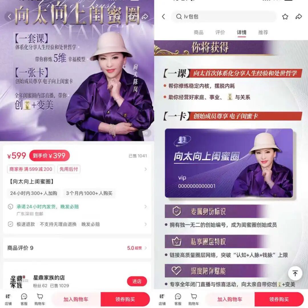 《听筒Tech》发现,在向太多个平台的橱窗,可以看到售出的课程名为《向太向上闺蜜圈》,课程相关信息宣称,“体系化分享人生经验和处世哲学,带你修炼5维幸福模型”,“创始成员尊享电子向上闺蜜卡”,“全年闺蜜圈内部直播,带你创富+变美”。